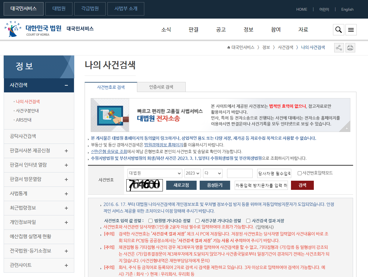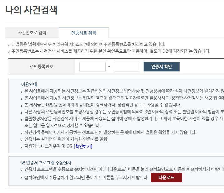 대법원 나의 사건 검색에서 '인증서로 검색' 클릭