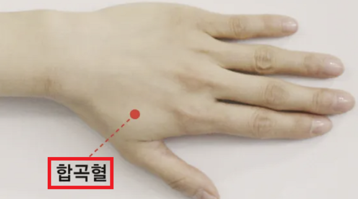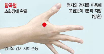 합곡혈(엄지와 검지 사이 움푹 들어간 부분): 지그시 눌러주면 소화 촉진 효과