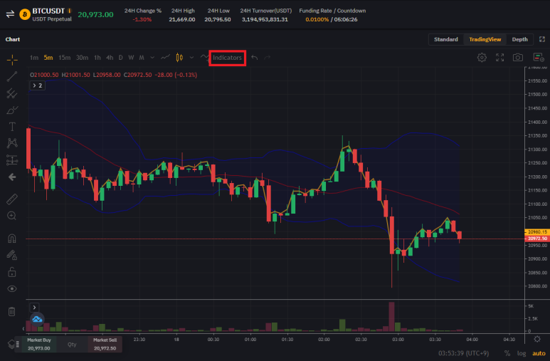 다루고 있는 가장 기본적인 지표인 볼린저밴드를 설정할 것이다. 빨간색으로 표시된 Indicators를 눌러 bb(bollinger bands)를 클릭하면 끝이다. 그럼 사진에 나오는 것처럼 위(상단), 아래(하단) 파란색 선과 중앙(중단) 빨간색 선이 나온다.