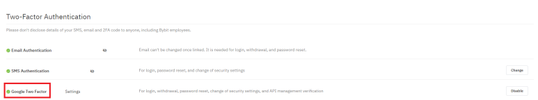 Google Two Factor를 눌러 바이비트와 구글 OTP QR코드로 연동 후, 핸드폰 OTP 앱에서 제공하는 보안 코드를 입력하면 된다.
