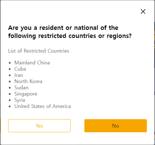 바이비트에서 허용하지 않는 국가들이다. 우리나라(South Korea)가 없으므로 No를 누른다.
