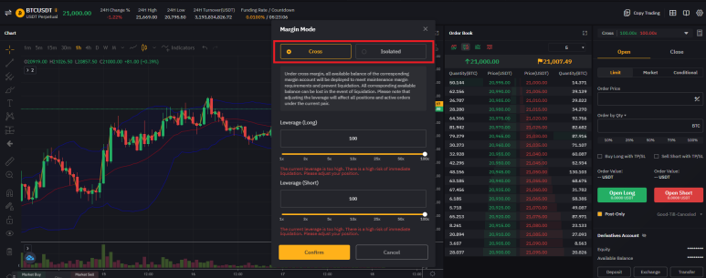 격리(Isolated) : 나의 계좌에 있는 자본금(코인이나 USDT)과 포지션(투자금)을 잡을 금액을 별도로 분리해서 거래를 하는 옵션으로 가장 많이 사용되고 있다. 청산 시 포지션(투자금) 금액만 청산되기 때문에 자본금을 지킬 수 있다는 장점이 있다. 예를 들어 100만 원을 가지고 있고, 10만 원으로 포지션을 잡은 상황에서 청산이 되면 10만 원만 청산된다는 말이다. 반대로 강제 청산 상황을 대비할 수 없다는 단점이 있다.(청산가가 다가오면 자본금을 투입해서 청산가를 올릴거나 내릴 수 있다.