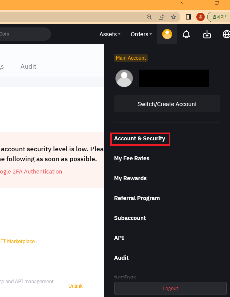 √ 우측 상단 사람모양 클릭 -> Account & Security