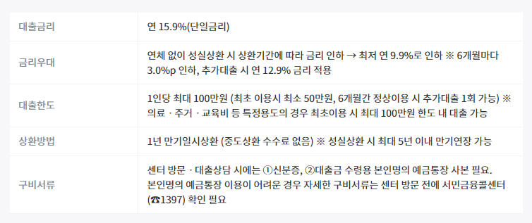 말 그대로 대부업 조차 이용이 어려워 불법사금융이 불가피한 고객들에게 서민금융진흥원에서 제공하는 대출 상품입니다.