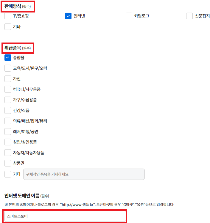 인터넷 도메인 이름은 오픈마켓인 경우 스마트스토어나 쿠팡으로 입력