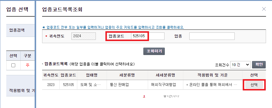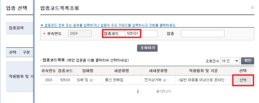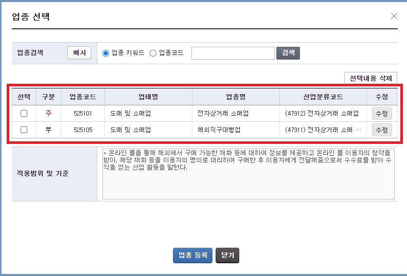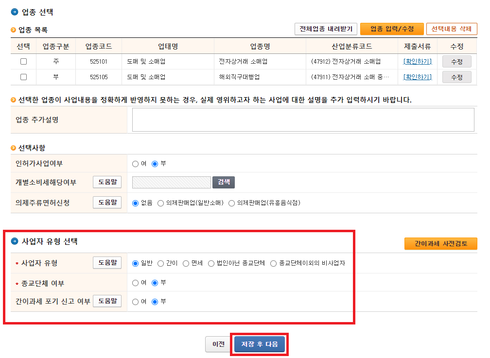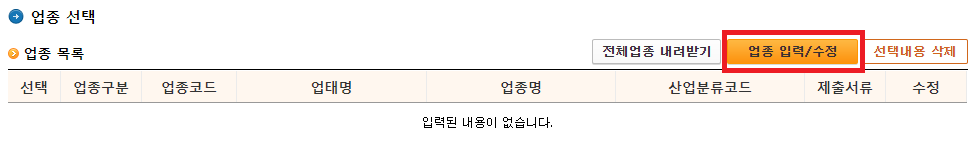 5. 업태 및 업종 번호 입력(★)