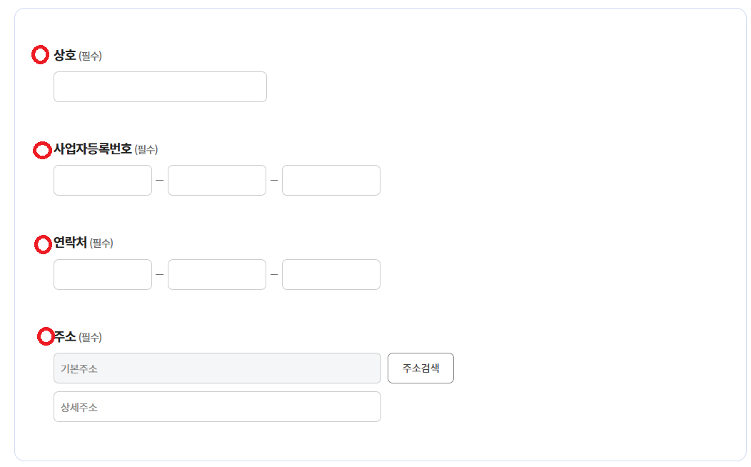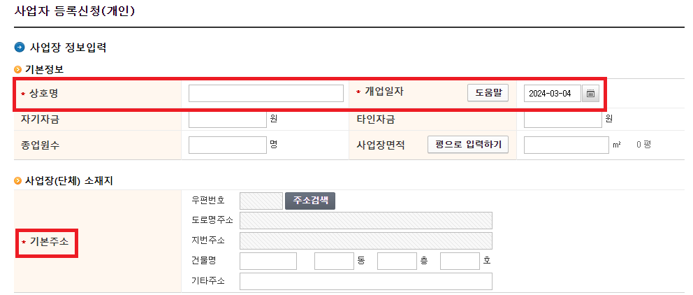 - 필수입력(*) 란을 입력(상호명, 개업일자, 기본주소)