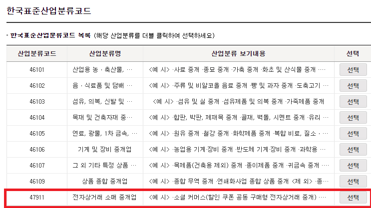 - 업태 : 도매 및 소매업 / 업종 : 전자상거래 소매업(525101)