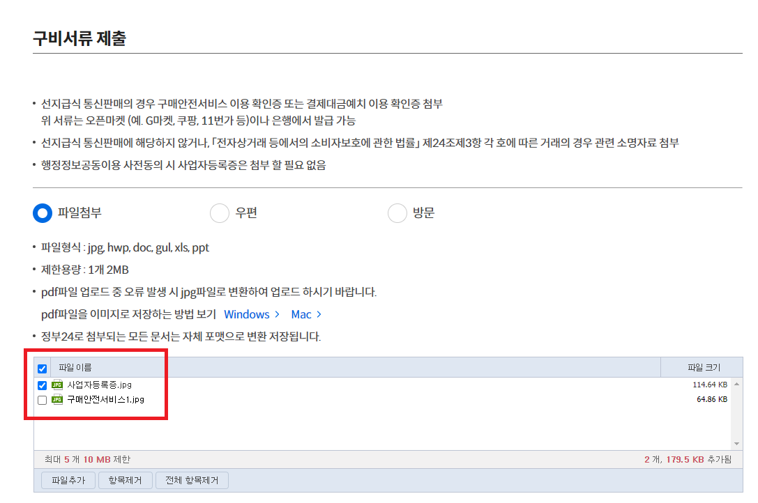 4. 구비서류 제출(사업자 등록증, 구매안전서비스 이용 확인증 첨부)