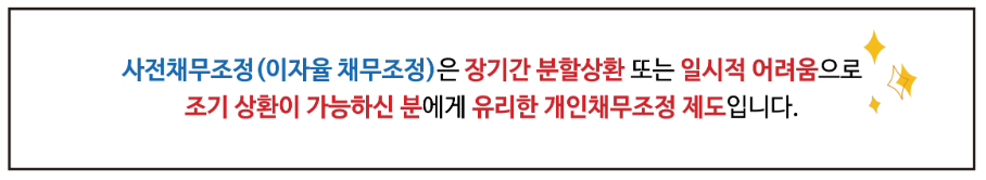 사전채무조정(프리워크아웃)이란 31일 이상 89일 이하 단기 연체가 있는 경우 이자율 인하 및 상환기간 연장을 통한 안정적인 채무상환을 지원하는 제도입니다. 개인적인 사정으로 신용카드대금이나 대출금 상환 부담이 크신 분들에게 금융채무불이행자가 되지 않고 연체이자 감면 등 가장 효율적인 부분에서 지원을 받을 수 있습니다.