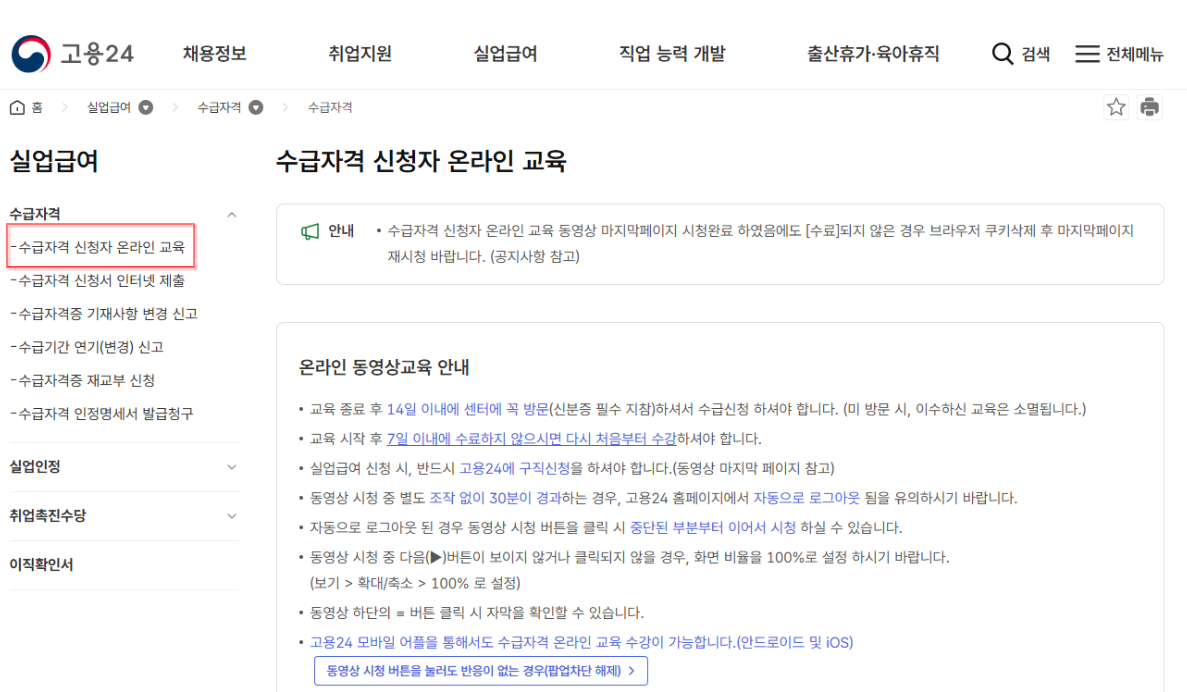 - 워크넷(https://www.work.go.kr) 사이트에서 접속해 실업급여 온라인 교육을 수강해야 합니다.