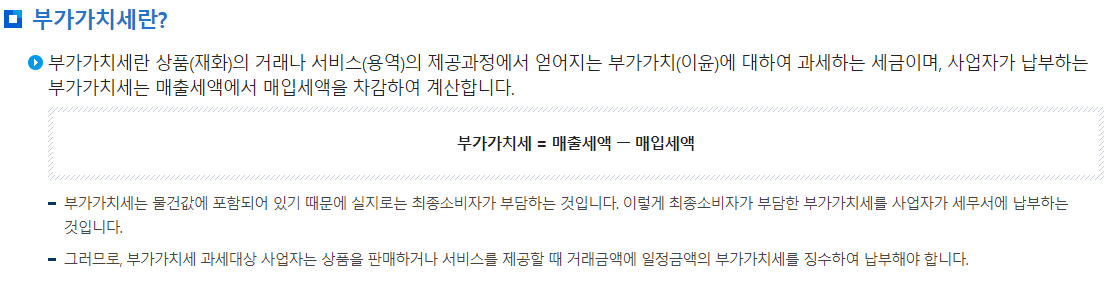 상품(재화)의 거래나 서비스(용역)의 제공과정에서 얻어지는 이윤에 대하여 과세하는 세금이며 사업자가 납부하는 부가가치세는 매출세액에서 매입세액을 차감하여 계산합니다.
