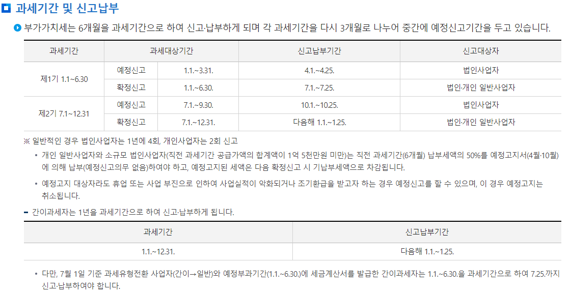 과세 기간은 1.1. ~ 12.31. // 신고 납부기간은 다음해 1.1. ~ 1.25.