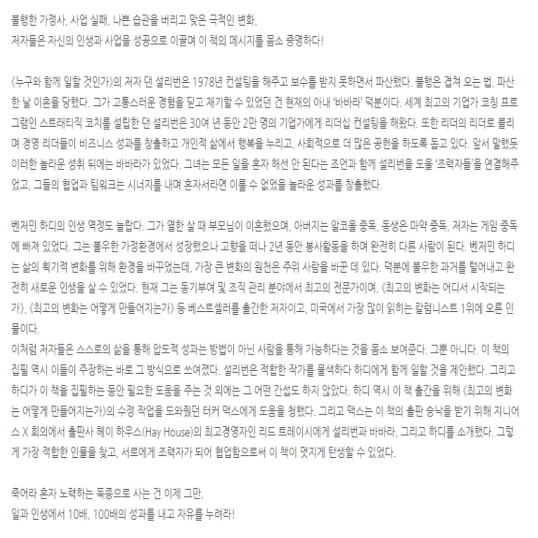 재능·노력·운보다 강력한 '사람'의 힘의 부제로 출간 된 '누구와 함께 일할 것인가'는 출간이 예정된 시점부터 많은 관심을 받아온 도서입니다. 현재 온라인, 오프라인 서점에서 판매중이며 23년 8월 출간되었습니다.