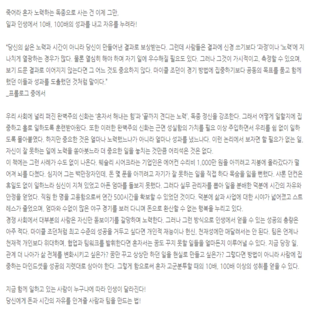 지금 함께 일하고 있는 사람이 누구냐에 따라 인생이 달라진다는 책의 본질적인 내용, 목표 달성을 위해 '방법'을 찾는 데 썼던 시간과 에너지를 '사람'으로 바꿈으로써 시간과 돈, 관계와 목적 등에 대한 자유를 얻을 수 있다.