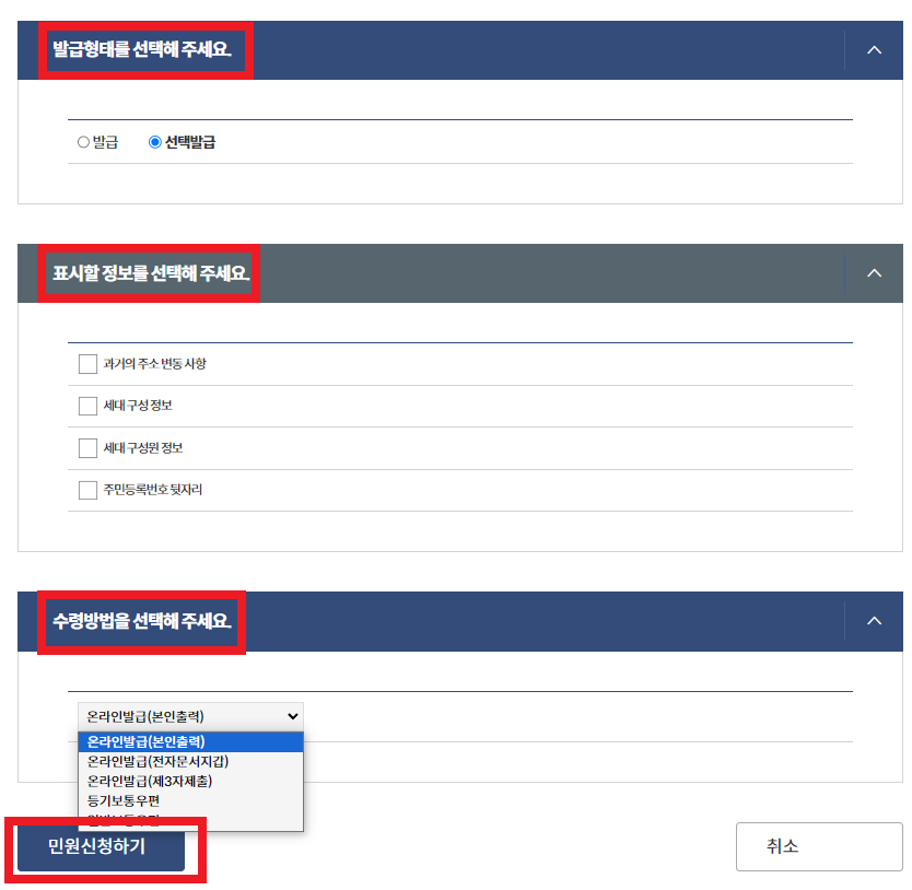 세부적으로 필요한 사항이 있으면 발급형태에서 항목을 확인 후 수령방법을 선택하고 민원신청하기를 클릭합니다.
