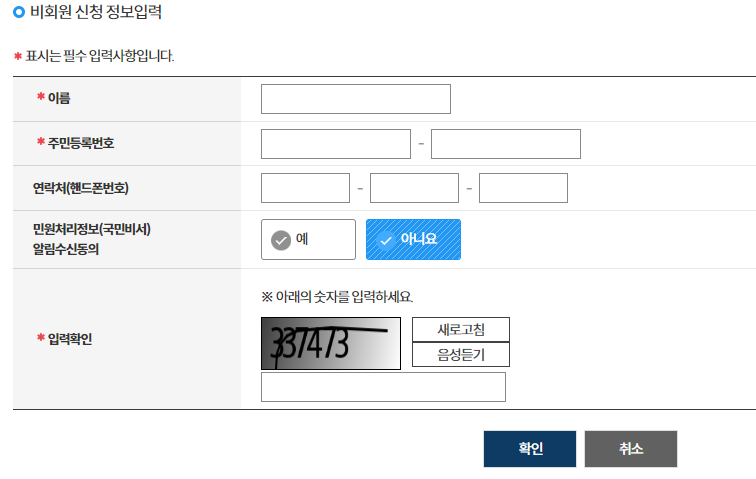 비회원은 정보 수집 이용동의와 비회원 신청 정보입력 후 가능합니다.