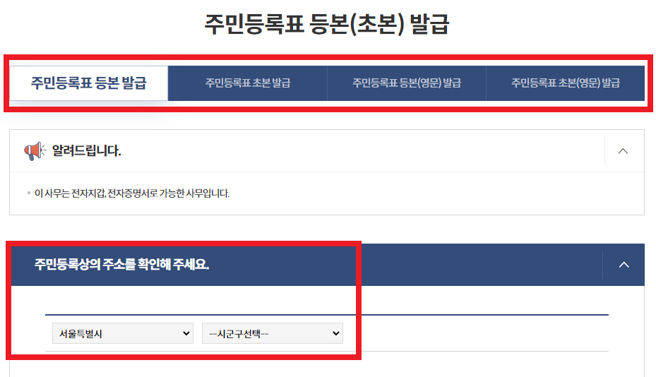 회원/비회원 로그인 후 필요한 서류(등본, 초본, 영문)를 선택하고 주민등록상 주소를 확인합니다.