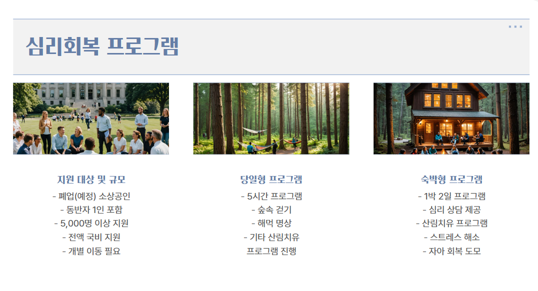 - 심리회복 프로그램 (산림치유 및 상담 지원)