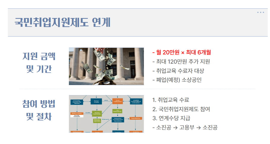 이번 사업은 폐업(예정) 소상공인을 대상으로 취업 교육(교육 수당 35만 원), 전직장려수당(최대 100만 원), 국민취업지원제도 연계(최대 120만 원), 심리회복 프로그램을 종합적으로 지원합니다.