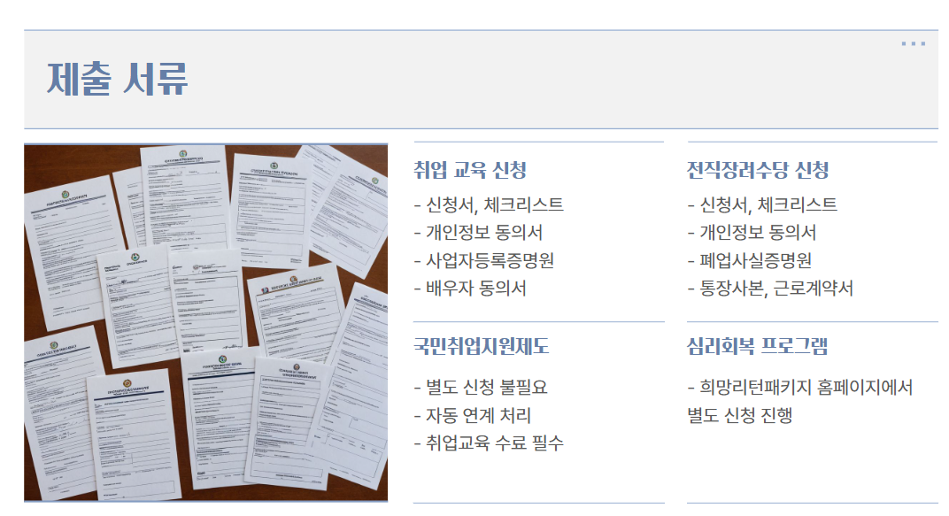 - 제출 서류 (취업교육, 전직장려수당, 국민취업지원제도 연계, 심리회복 프로그램)